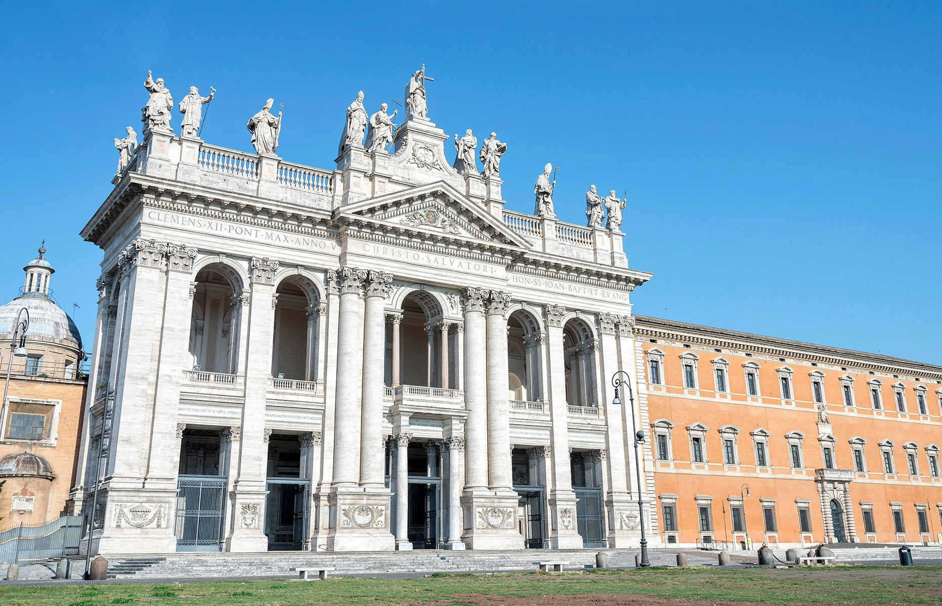 파사드는 맨 위 예수 그리스도를 중심으로 성인들의 거대한 조각상들이 세워져있다. 파사드 우측으로 보이는 건물이 라테라노 궁전이다.